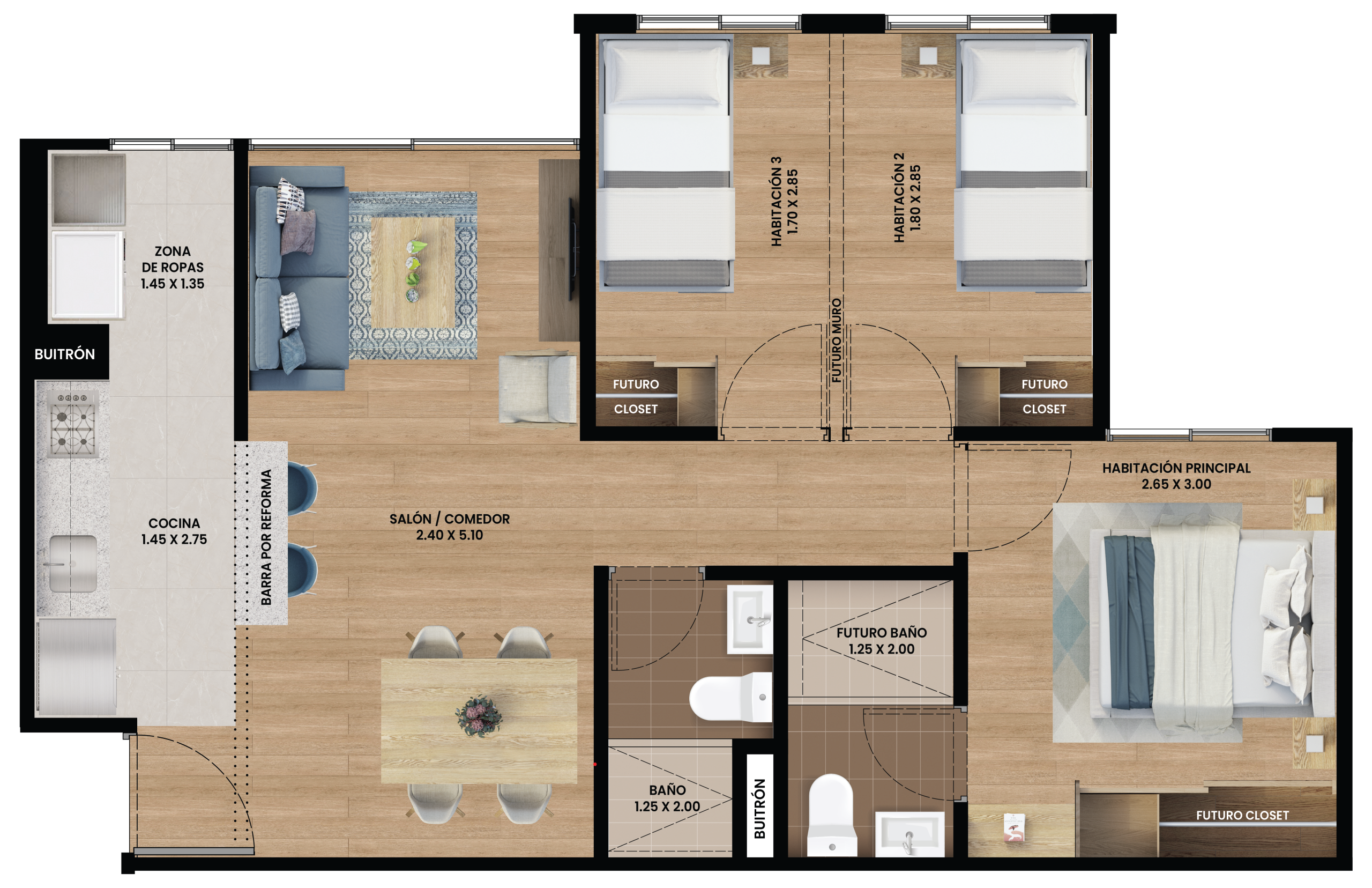 Te invitamos a realizar un recorrido donde tendrás la posibilidad de descubrir la distribución de nuestro apartamento.